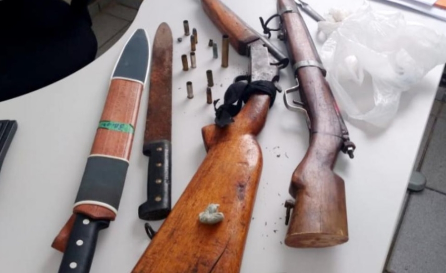 Ainda segundo a PM, o homem informou que tinha armas de fogo em sua residência. De imediato, a guarnição se deslocou até o local e encontrou duas armas de fogo modelo Espingarda (1 cartucheira e 1 bate-bucha), além de munições de 32 e 38 e dois facões.