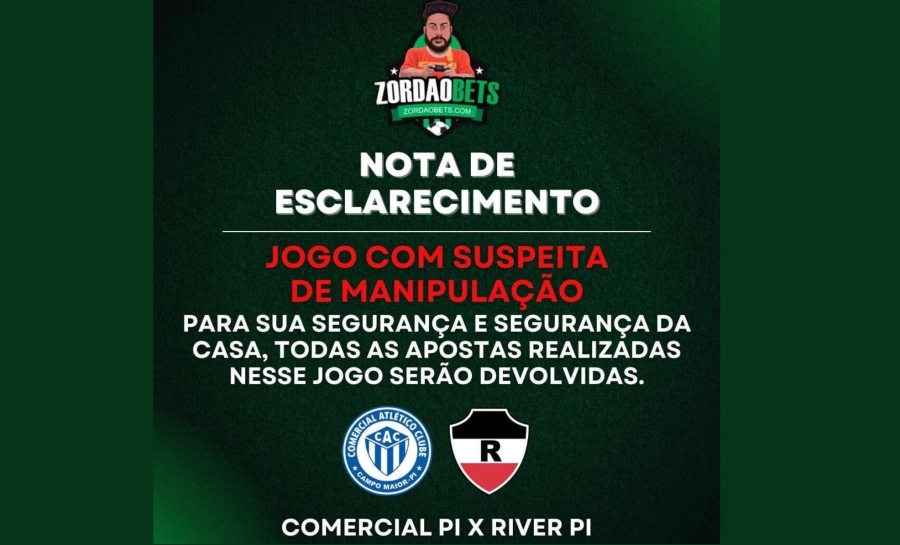 A banca de apostas esportivas Zordão Bets divulgou através de uma nota de esclarecimento nesta quarta-feira (01) logo após a partida entre Comercial e River em Campo Maior que o jogo teria suspeita de manipulação no resultado.