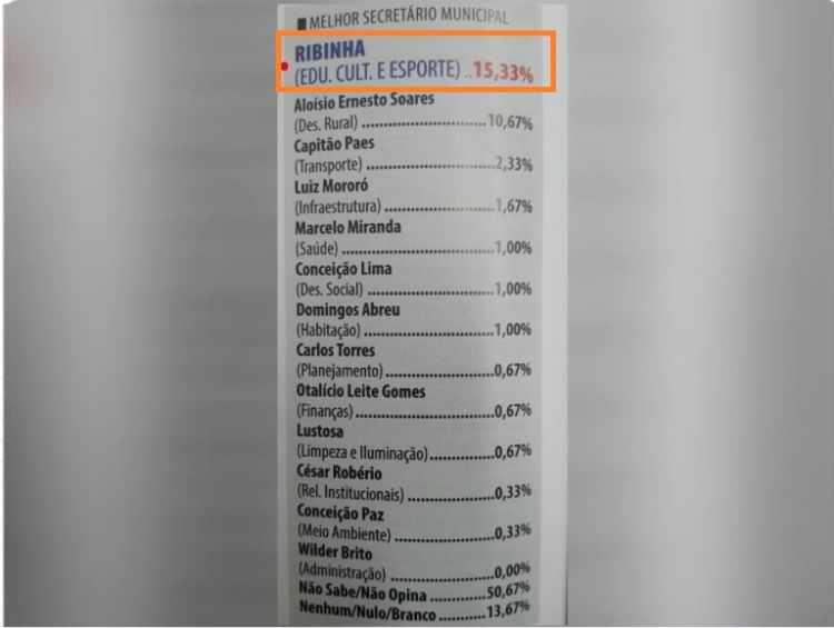 A primeira foi para vereador onde o petista Fernando Miranda aparece em primeiro lugar como o melhor parlamentar na opinião popular superando os demais 12 vereadores (VEJA AQUI). E a segunda foi a avaliação do secretariado da atual gestão encabeçada pelo Prefeito Paulo Martins (PT) onde mostra que o Professor Ribinha (PT) foi escolhido pela população campo-maiorense como o melhor secretário municipal com 15,33 % da preferência dos entrevistados.