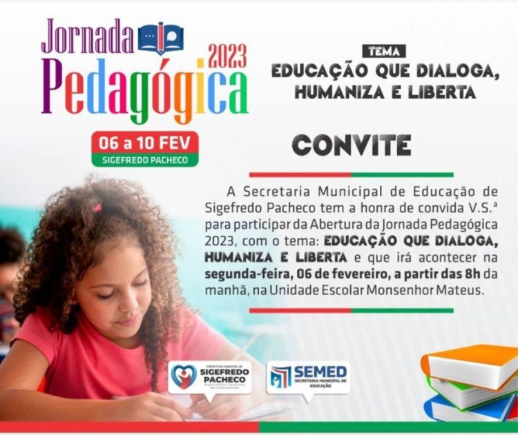 A Prefeitura Municipal de Sigefredo Pacheco (PI) através da Secretaria de Educação convida pais, alunos e responsáveis para participar da Abertura da Jornada Pedagógica 2023, com o tema: EDUCAÇÃO QUE DIALOGA, HUMANIZA E LIBERTA e que irá acontecer na segunda-feira, 06 de fevereiro, a partir das 8h da manhã, na Unidade Escolar Monsenhor Mateus.