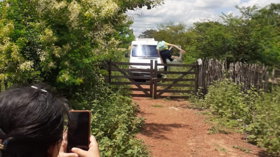 As crianças, algumas delas com deficiência, estão sendo obrigadas a pularem uma cancela que foi colocada, fechada com corrente e cadeado, impedindo o tráfego de veículos pela principal estrada utilizada para o transporte dos alunos.