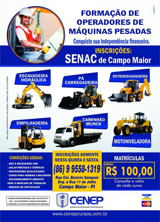 A CENEP CURSOS oferece a toda população de CAMPO MAIOR e REGIÃO, a oportunidade de se tornarem profissionais para o mercado de trabalho. Estarão sendo ministrados diversos cursos na área de operador de máquinas pesadas para homens e mulheres, dentre eles: escavadeira hidráulica, pá carregadeira, retro escavadeira, caminhão munck, motoniveladora e empilhadeira.