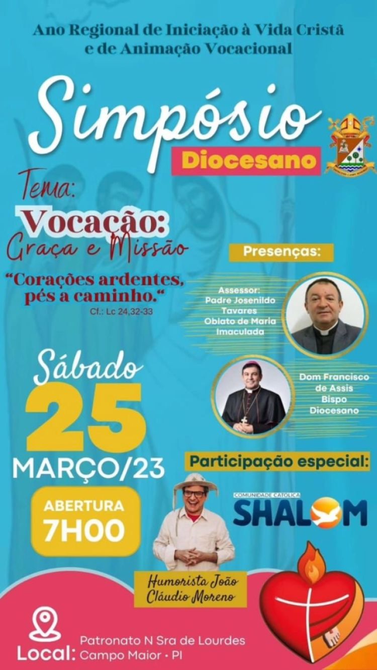 A cidade de Campo Maior (PI) receberá no dia 25 de março (sábado) o Simpósio Diocesano no Patronato Nossa Senhora de Lourdes. Com entrada gratuita, o evento começa as 07:00 da manhã com atividades e troca de experiências vocacionais para a juventude, casais e famílias da Diocese.