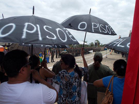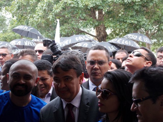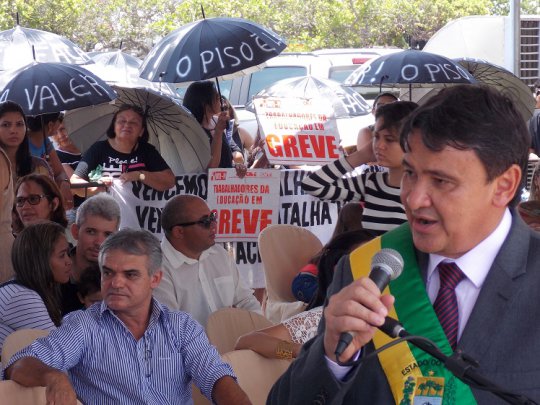 “Ão, Ão, Ão chegou o enrolão”. Com essas palavras o governador Wellington Dias (PT) foi recepcionado por um grupo de professores da rede estadual de ensino na manhã deste domingo (13/03) na cidade de Campo Maior, durante as comemorações dos 193 anos da Batalha do Jenipapo. Os grevistas acompanharam a solenidade com faixas, palavras de ordem e vaias.