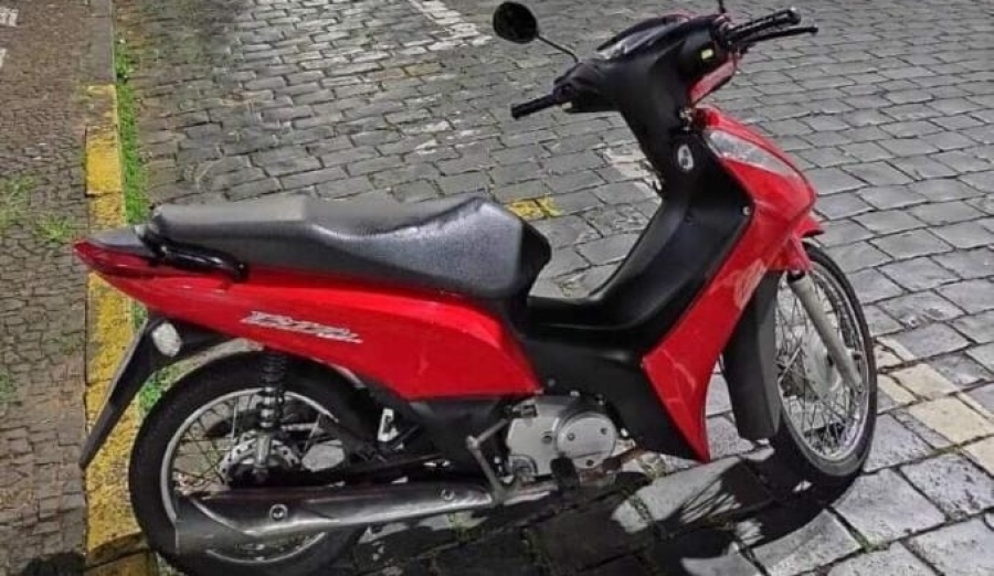 A motocicleta, modelo Honda, BIZ 125, de cor vermelha, placa NIO-2382, tem rodão e paralamas pretos.