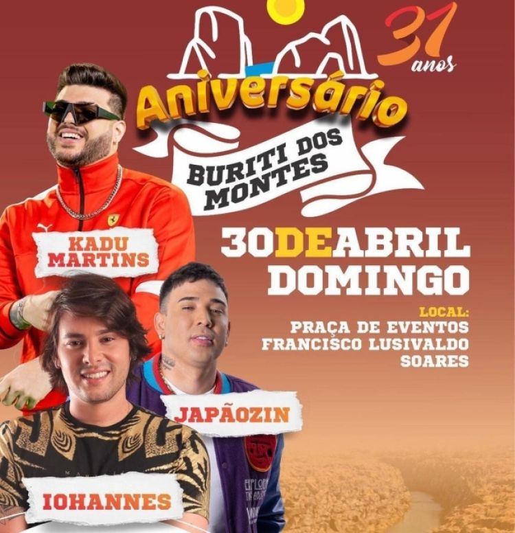 A Prefeitura de Buriti dos Montes (PI) divulgou nesta terça-feira (25) as atrações musicais que agitarão o aniversário de 37 anos do município. As atrações são, Kadu Martins, Japãozin e Iohannes.