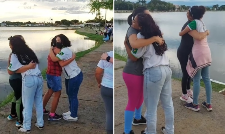 Os alunos foram ao calçadão do Açude Grande, no centro da cidade, e surpreenderam cada pedestre encontrado, com o pedido de um abraço.