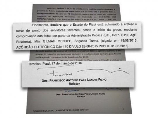 O desembargador Paes Landim determinou também o bloqueio da conta do sindicato e que o governo do Estado apresente num prazo de 10 dias uma proposta para acordo com a categoria, relatórios, estudos e laudos técnicos que demonstrem a atual situação financeira do estado, o impacto da implementação do reajuste reivindicado pela categoria sobre o equilibro orçamentário e financeiro do Piauí.