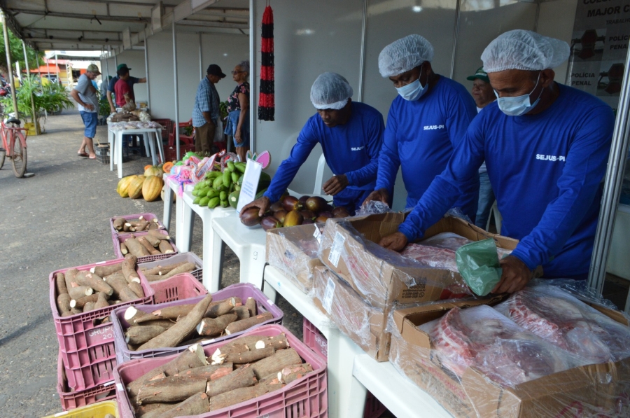 No evento está sendo comercializada a produção realizada nessas unidades como macaxeira, feijão, mamão, berinjela, banana, artesanatos, além da carne suína.