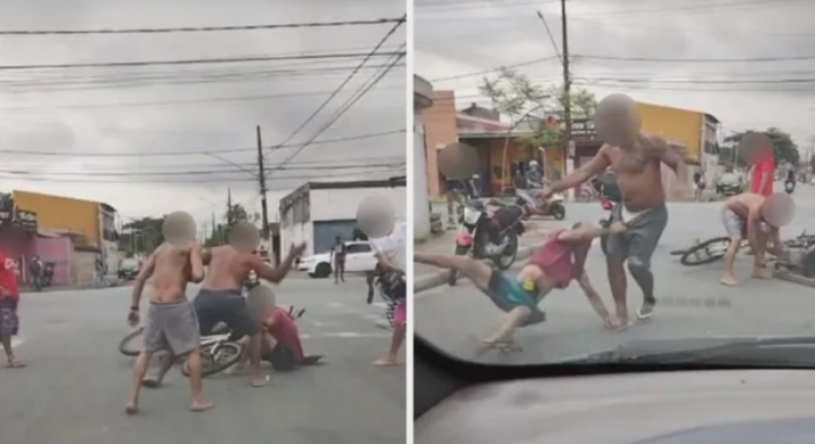 A agressão ocorreu, na última quarta-feira (3), entre a Rua Tambaú e a Avenida Oswaldo Cruz, em Vicente de Carvalho. As imagens mostram o homem de camiseta vermelha sentado no meio da rua e rodeado por três moradores. Um deles, de camiseta branca e boné, bate com um capacete na cabeça do homem.