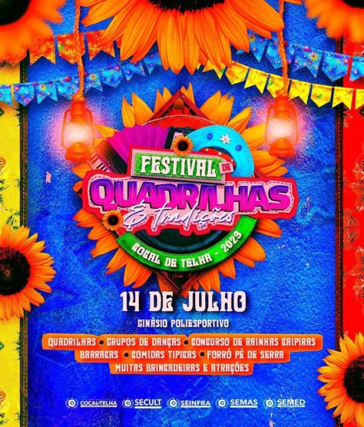 A Prefeitura de Cocal de Telha (PI) em parceria com as secretarias municipais vai realizar o Festival de Quadrilhas e Tradições 2023 no dia 14 de julho no Ginásio Poliesportivo. O evento contará com muita música, concursos culturais, apresentações de quadrilha,comidas típicas e muito mais.