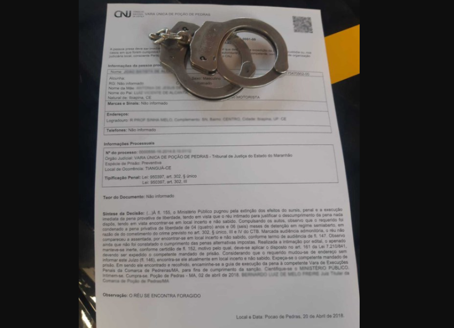 De acordo com informações da PRF, o homem foi abordado durante uma fiscalização e ao verificarem os documentos constataram que é um foragido da justiça do estado do Maranhão pelo crime de homicídio culposo ocorrido há cinco anos em Tianguá-CE, expedido pela Vara Única de Poção de Pedras, em 20 de abril de 2018.