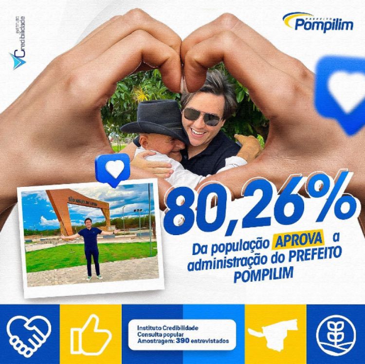 Pesquisa realizada pelo Instituto Credibilidade, divulgada nesta segunda-feira (19), revela que mais de 80% da população de São Miguel do Tapuio aprova a gestão do prefeito Pompílio Evaristo (PSD), o Pompilim.