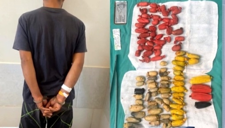Ao ser questionado, o suspeito confessou que um grupo de traficantes o obrigou a engolir mais de 80 porções de drogas, seis cabos USB e três isqueiros. Os itens estavam dentro de bexigas de balão.