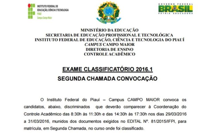 O Instituto Federal do Piauí (IFPI) divulgou a convocação de segunda chamada do Exame Classificatório 2016.1. Para confirmação de matrícula, os convocados devem apresentar a documentação listada no item 11.2 do edital nº 81/2015.