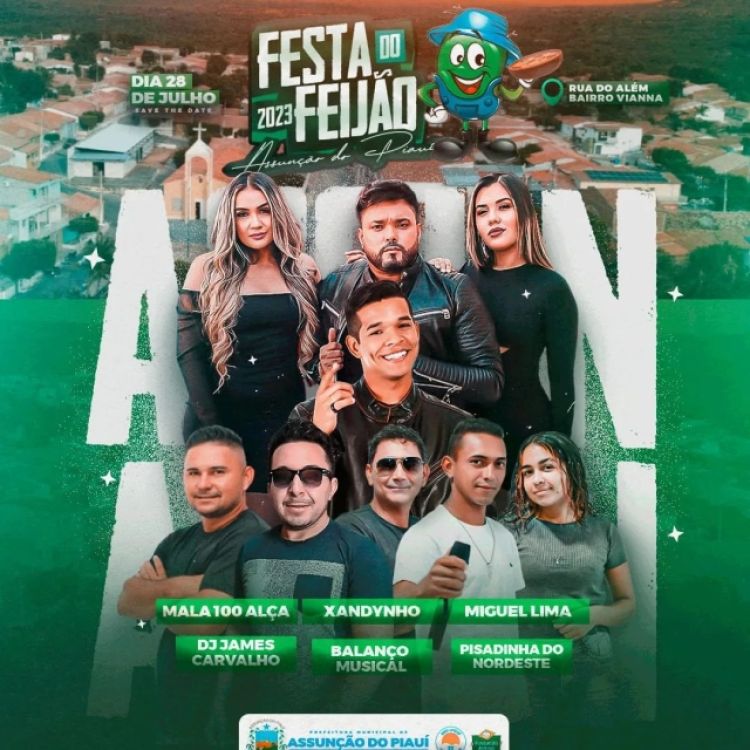 A Prefeitura de Assunção do Piauí divulgou a programação oficial da Festa do Feijão 2023. O evento acontecerá no dia 28 de julho com uma programação cultural e artística com os shows das bandas Mala 100 Alça, Xandynho, Pisadinha do Nordeste, Dj James Carvalho, Miguel Lima, João Pedro e Balanço Musical.