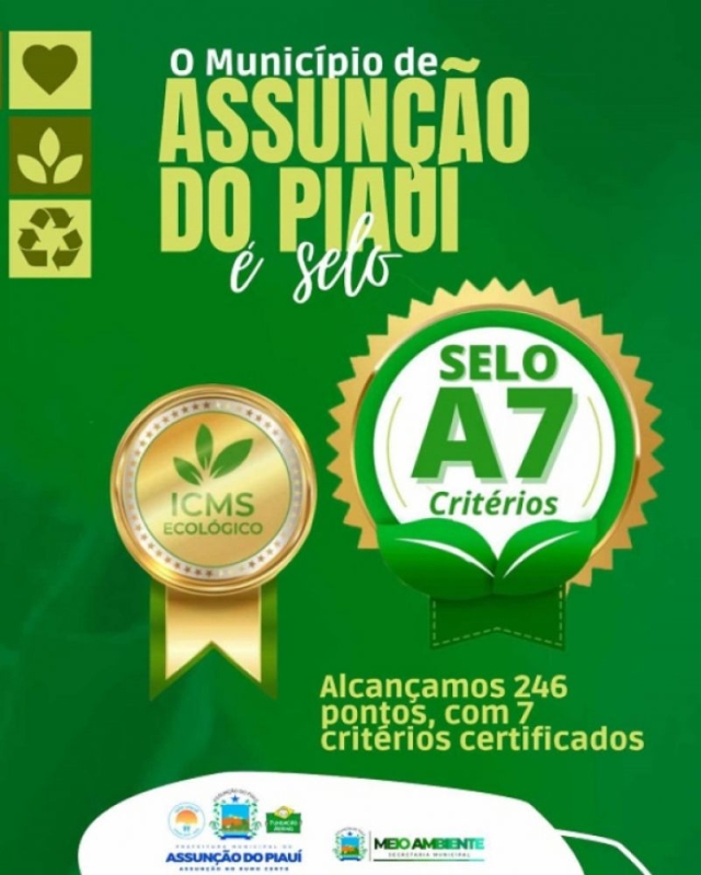 A cidade de Assunção do Piauí, na gestão do prefeito Antônio Luiz Neto “Netinho” (PSD), através da Secretaria Municipal de Meio Ambiente, conquistou, pelo terceiro ano consecutivo, o Selo ‘A’ na Certificação de SELO Ambiental 2023 – ICMS ECOLÓGICO. No entanto, essa já é a quarta vez que o município conquista a Certificação Ambiental, onde em 2020 obteve o Selo B, com 4 critérios atingidos.