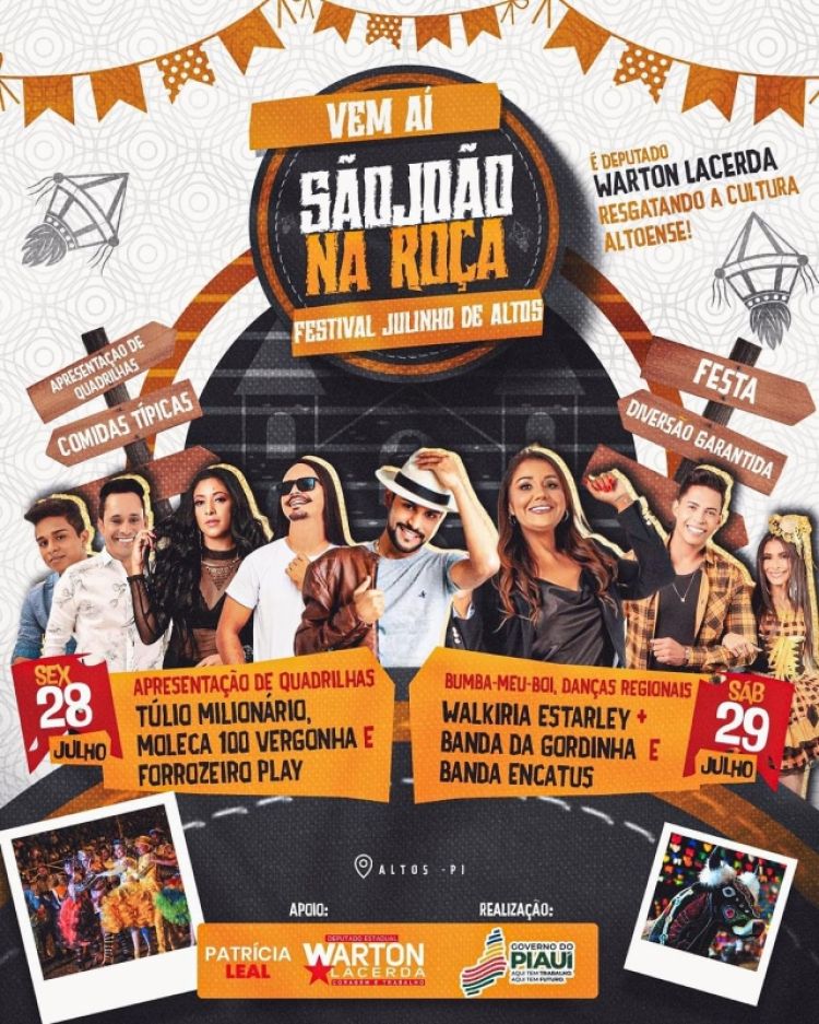 A cidade de Altos (PI) receberá nos dias 28 e 29 de julho o Festival São João na Roça na praça da localidade Quilombo, zona rural do município. A festa é uma realização do Governo do Estado com apoio do Deputado Warton Lacerda e da Patrícia Leal.