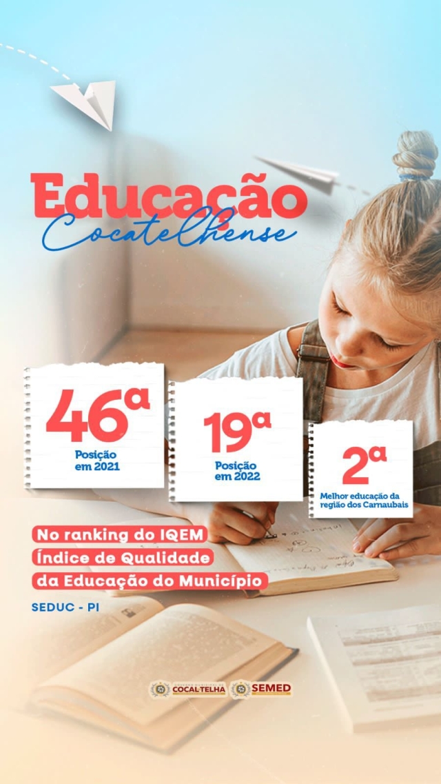 "Uma jornada inspiradora na Educação de Cocal de Telha! Estamos emocionados em compartilhar essa incrível conquista: em 2021 estávamos na 46ª posição no ranking educacional de todo o Piauí e, com muito trabalho e dedicação, alcançamos a surpreendente 9ª posição em 2022! Não só isso, mas também temos a honra de sermos reconhecidos como a 2ª melhor educação do território dos Carnaubais. Continuaremos unidos, impulsionando a excelência educacional e preparando nossos jovens para um futuro brilhante", disse a gestora.