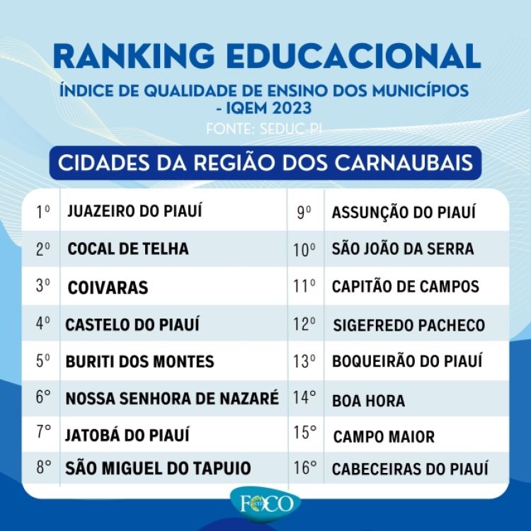 A Secretaria Estadual da Educação do Piauí divulgou o ranking dos municípios piauienses, a partir do IQEM – Índice de Qualidade da Educação do Município usado para rateio dos recursos do do ICMS-Educação 2022, composto por: IDEPI ALFA, IDEPI F1, Índice de Equidade – Ieq; Índice Socioeconômico.