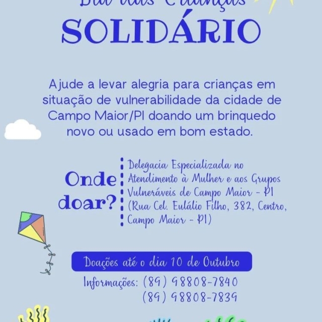 A Delegacia Especializada de Atendimento à Mulher e aos Grupos Vulneráveis (DEAMGV) de Campo Maior (PI) está fazendo campanha de arrecadação de brinquedos novos e usados (em bom estado) para distribui-los dia 12 de outubro de 2023 a crianças em situação de vulnerabilidade social da cidade de Campo Maior - PI, em simbólico Dia das Crianças Solidário, assegurando a esse público o direito ao lazer por meio de brinquedos.
