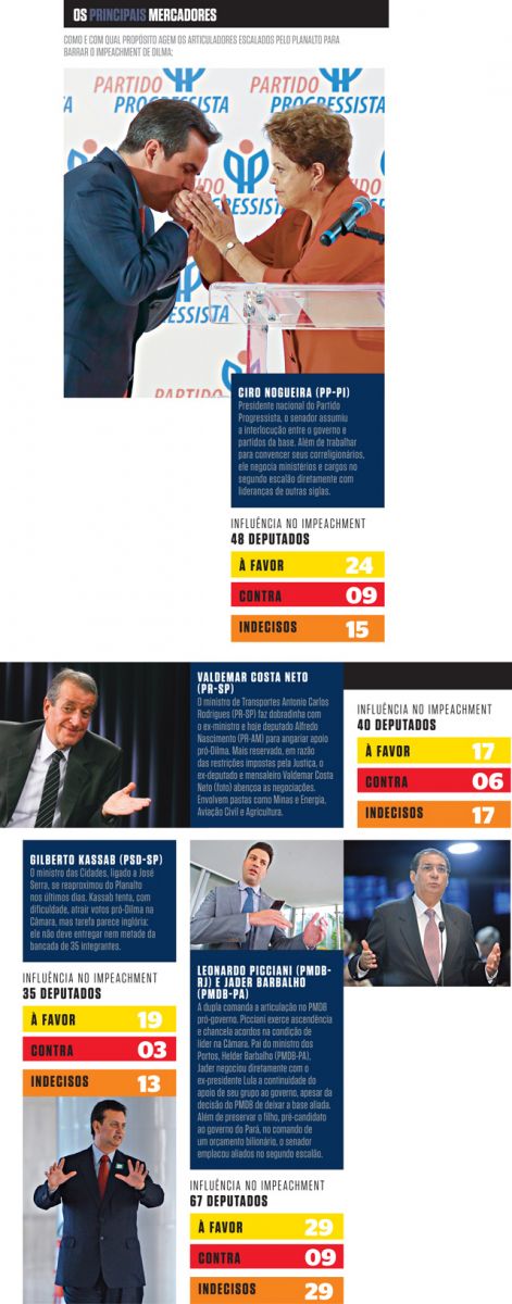 Segundo a publicação, o senador pelo Piauí Ciro Nogueira (PP) seria um dos interlocutores para negociar com um novo mensalão com deputados. “Recentemente, ele foi alçado à condição de articulador oficial e, em incontáveis reuniões, levou ofertas a diversos aliados e indecisos. A negociação rendeu frutos ao governo: ele conseguiu postergar a decisão da bancada do partido - que conta com 51 deputados e seis senadores - sobre aderir ou não ao impeachment. Ciro é um dos mercadores pelo PP no balcão de negócios. Na Câmara, o PP conta com os préstimos de Aguinaldo Ribeiro (PP-PB), que já se posicionou declaradamente contra o impeachment” diz a publicação sobre o senador piauiense.