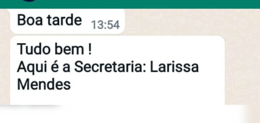 “Boa tarde, tudo bem. Aqui é a Secretária: Larissa Mendes”, diz a mensagem do primeiro contato feito pelos criminosos que utilizam o número (86) 8857-5978 para encaminhar as mensagens via aplicativo whatsapp.