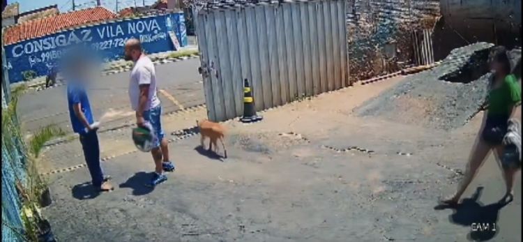 A vítima correu para rua para fugir do pai, o dono da lava-jata tenta acalmar a confusão, mas o pai e a madrasta tentam novamente agredir a vítima.
