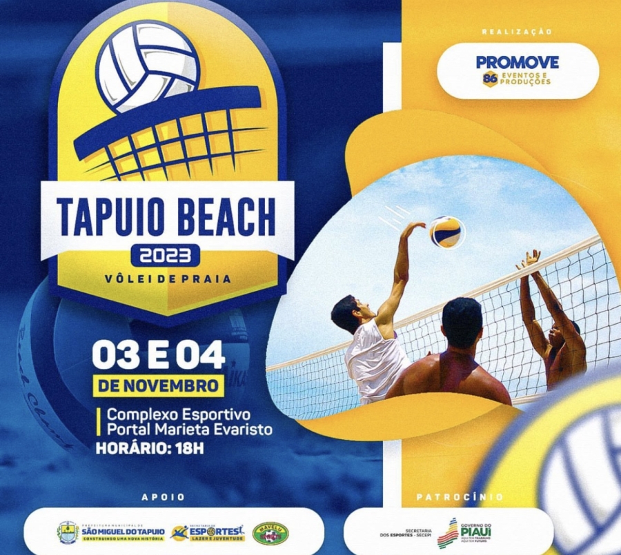 O campeonato de vôlei de praia Tapuio Beach 2023 no município de São Miguel do Tapuio (PI) será realizado nos dias 3 e 4 de novembro, que promete movimentar a cidade de São Miguel do Tapuio e toda a região Norte do Piauí. O evento acontecerá no complexo esportivo Portal Marieta Evaristo, com início às 18h. A competição terá o patrocínio do Governo do Estado, por intermédio da Secretaria dos Esportes.