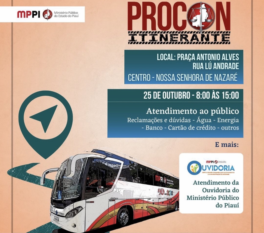 A prefeitura de Nossa Senhora de Nazaré anunciou nessa segunda-feira (23) que nesta quarta-feira, 25 de outubro, das 09h às 15h, o Procon Itinerante estará na cidade para atender a população.