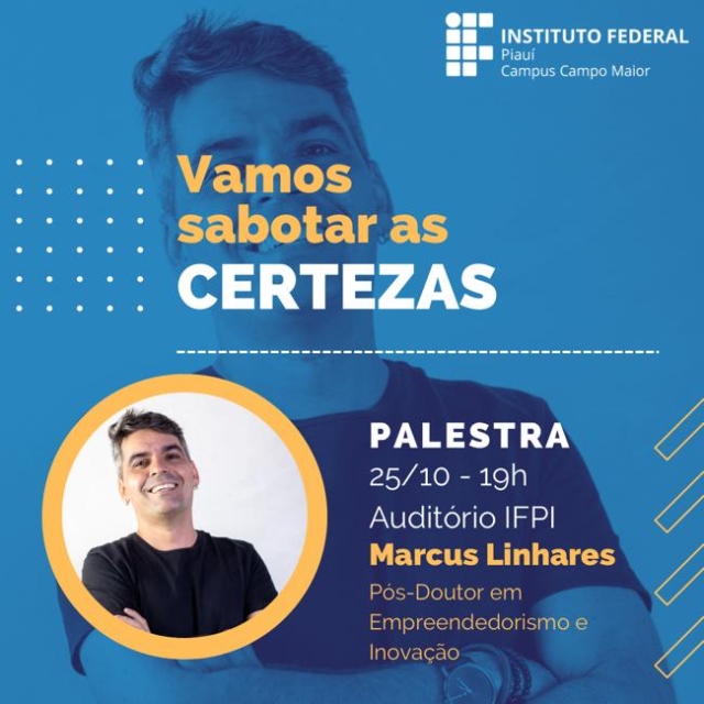 No dia 25 de outubro, às 19h, terá uma palestra com Marcos Linhares, doutor em empreendedorismo e inovação. Será no auditório do Instituto Federal do Piauí Campus Campo Maior. Na palestra, os assuntos abordados será sobre negócios inovadores, transformação digital e tudo que está acontecendo em volta do mundo quando o assunto é inovação.