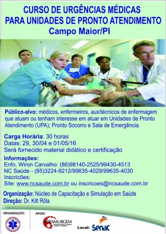 The course has as target audience: doctors, nurses, aux / techni. nurses who work or intend to work in PSUs, first aid and emergency rooms. Plan to 29 and 310/04 and 01/05. already visit the site and register: www.ncsaude.com.br or via phone (85) 3224.9212 or (86) 9 8140 2525 to speak to Wiron the Health Department.