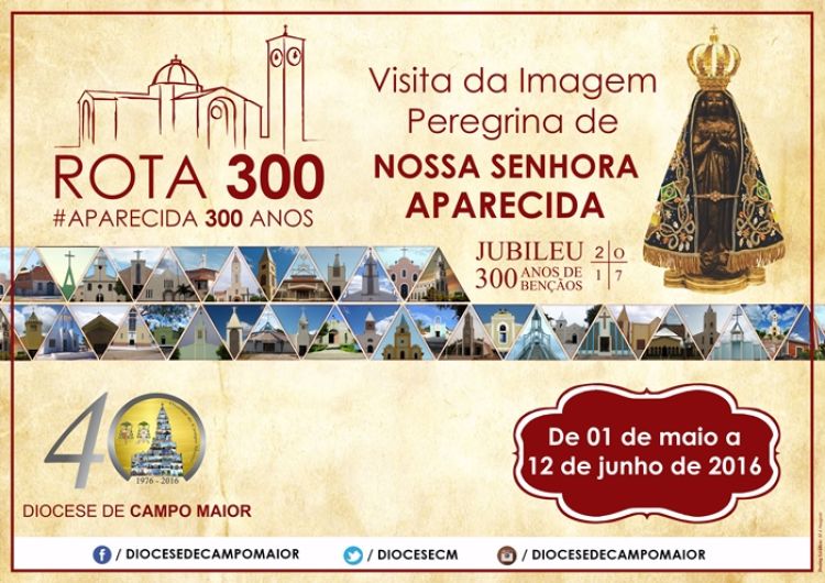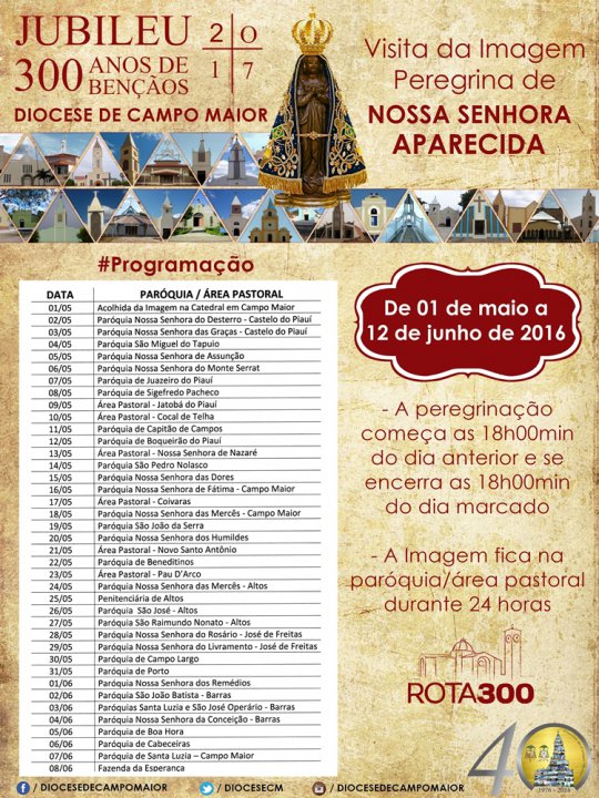 The Roman Catholic Diocese of Campo Maior released on the afternoon of Saturday (23), social networks through the official program of the visit of the image of Our Lady Aparecida. The image must wander through all the parishes and pastoral areas of the particular Church Campomaiorense. It shouldnt arrive on April 30 and begin to travel from May 1.