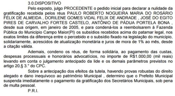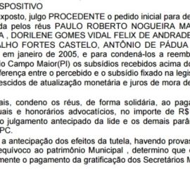 The judge declared null the received gratification by the defendants Paulo Roberto Nogueira, Maria do Rosario Felix Dorilene Vidal Felix Andrade, Joseph of Egypt Pires de Carvalho Fortes Castle and Anthony of Padua Portela Bonn, since its inception in January 2005 and sentenced to reimburse the Treasury do Campo municipality Greater received subsidies above the statutory level in the exact limits of the difference between the perceived and the allowance Set in the municipal legislation. The money must be returned with interest and monetary restatement.