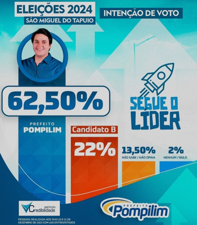 Em uma pesquisa feita pelo Instituto Credibilidade e divulgada nesta sexta-feira (22), aferiu as intenções de votos para as eleições de 2024, e revelou que o nome do prefeito Pompilim de São Miguel do Tapuio, Piaui aparece com 62,50% de intenções de votos em uma possível reeleição.