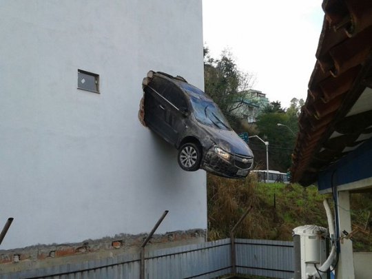 Um carro ficou pendurado em um prédio residencial, na avenida das Nações, no bairro Colatina Velha, em Colatina, no Noroeste do Espírito Santo, por volta de 6h, desta sexta-feira (14).