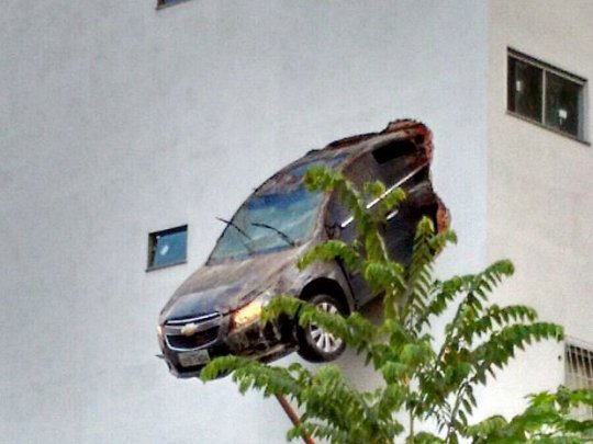 O veículo ficou pendurado, no segundo pavimento do prédio, a 15 metros de altura do chão.