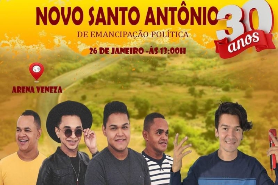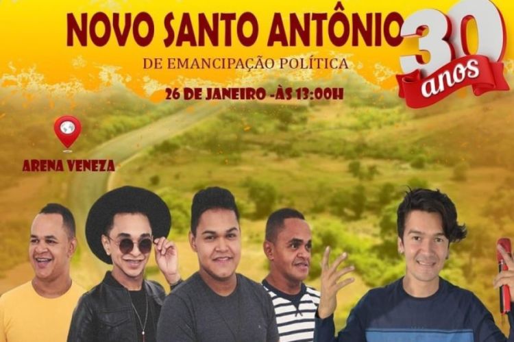 A prefeitura de Novo Santo Antonio (PI) divulgou agenda com Zé Cantor e banda regionais para festa pública na noite do próximo dia 26 de janeiro, pelos 30 anos de emancipação política do município.