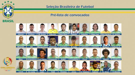 Forwards : Lucas (Paris Saint-Germain-FRA), Douglas Costa (Bayern Munich-ALE), Luan (Gremio), Hulk (Zenit-RUS), Roberto Firmino (Liverpool-ENG), Jonas (Benfica-POR), Alex Teixeira (Shakhtar Donetsk-UCR), Gabriel (Santos), Gabriel Jesus (Palmeiras) and Ricardo Oliveira (Santos).