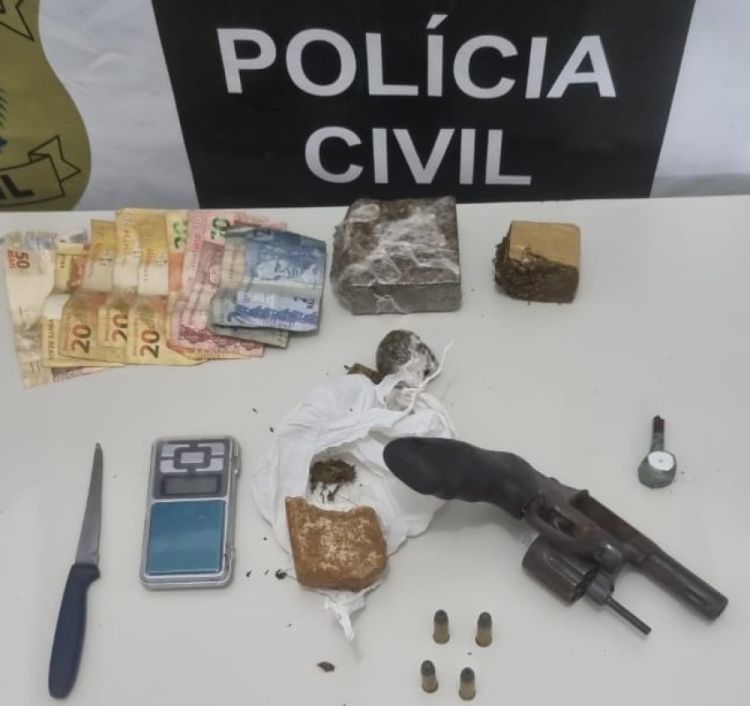 Durante o cumprimento do mandado de prisão, o suspeito também foi flagrado na posse de drogas, balança de precisão, dinheiro trocado e sacos plásticos para embalagens dos entorpecentes, além de uma arma de fogo.