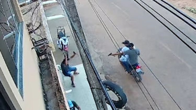 Nas imagens é possível ver o momento em que dois homens em uma moto se aproximam da vítima, que está sentada em uma cadeira na calçada de um comércio. O garupa puxa uma arma e começa a atirar antes mesmo do piloto parar o veículo.