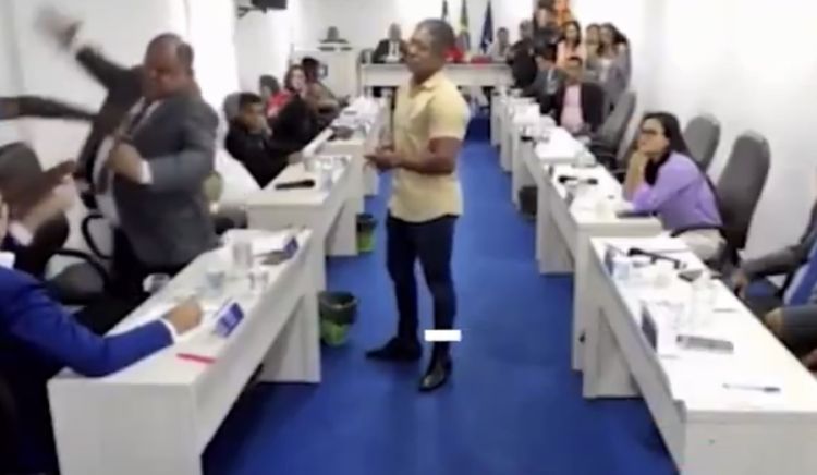 Uma briga entre dois vereadores suspendeu os trabalhos na Câmara Municipal de Lauro de Freitas, cidade da Região Metropolitana de Salvador, nesta quarta-feira (28). Loxa Lopes (PP) deu um tapa no colega Gabriel Bandarra, mais conhecido como Tenóbio (União Brasil), após trocarem agressões verbais.