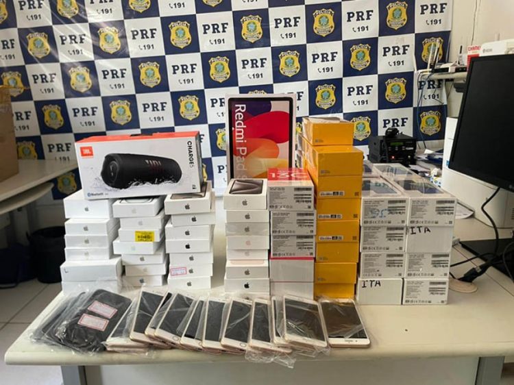 Os aparelhos eletrônicos foram encontrados também no interior do bagageiro, dentro de três caixas, dentre os aparelhos eletrônicos, se incluía celulares de diversas marcas, carregadores e relógios digitais. E que nenhum dos itens possuía nota fiscal, o que configura o crime de Descaminho.