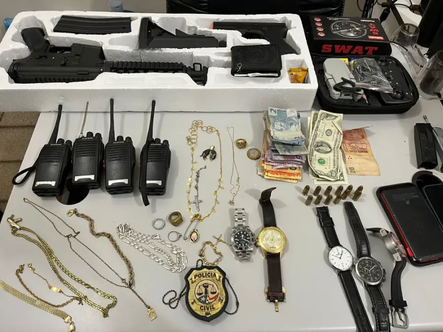 Durante as prisões, os policiais apreenderam joias, dinheiros e outros pertences de vítimas de roubos, além do material usado pelos criminosos para cometer os assaltos: rádios de comunicação, simulacros de fuzil e pistola, distintivos da Polícia Civil e outros objetos.