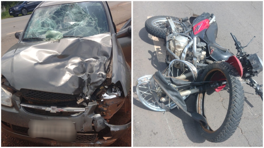 Em imagens é possível vê os estragos do impacto na moto e no veículo.
