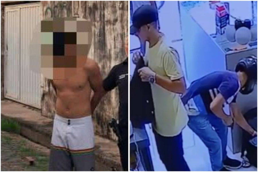 Em imagens feitas por câmeras de segurança do local, um dos assaltantes que está vestido com uma blusa listrada, calça e capacete fica com uma arma de fogo na mão, enquanto as pessoas que estavam no estabelecimento ficam paradas. O outro de camisa amarela, calça jeans e um chapéu abre uma mochila e começa a colocar alguns objetos dentro.