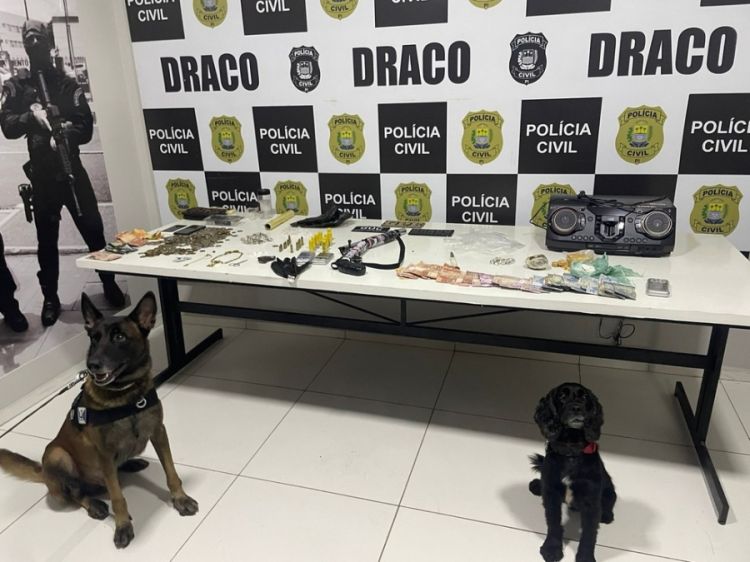 Durante a ação, foram apreendidas drogas, 01 armas de fogo, munições, celulares, balança de precisão, dinheiro e um veículo utilizado na comercialização dos entorpecentes.