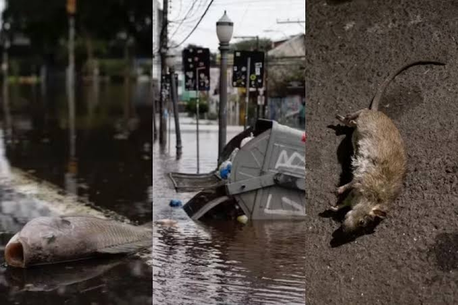 Após a destruição de casas e comércios pela cheia do Guaíba, moradores de Porto Alegre convivem com as consequências da água, que atingiu o maior nível já registrado desde 1941. Agora são vistos animais mortos e há esgoto exposto. O mau cheiro está impregnado nas ruas dos bairros Menino Deus, Cidade Baixa e Centro Histórico.