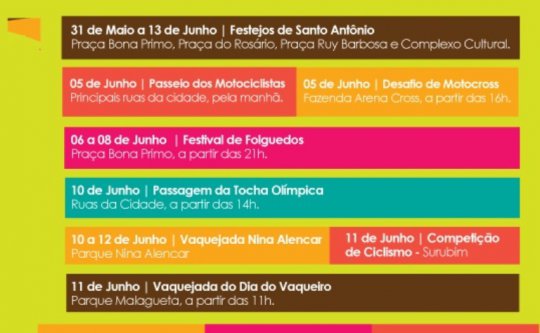 O Secretário de Cultura, Esporte e Lazer, Ulisses Raulino, disse que a equipe organizadora está terminando de fechar toda programação do evento. “Até o dia 25 de maio anunciaremos a programação das bandas”, afirmou. A festa inclui festival junino, vaquejada, moto cross, shows de humor, religioso e muito mais.