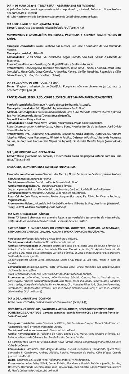 A programação ainda ressalta a visita da Imagem Peregrina de Nossa Senhora Aparecida, que está percorrendo todas as cidades da Diocese de Campo maior desde o dia 30 de abril, como também as comemorações pelos 40 anos de criação da diocese.